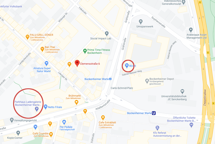 Parkhaus Rewe in der Gräfstraße 92, 60487 Frankfurt oder Parkhaus Ladengalerie Bockenheimer Warte, Adalbertstraße 10, 60486 Frankfurt am Main.