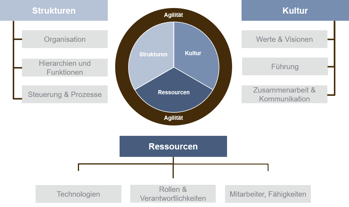 Agilität ist Voraussetzung, um die Leistungsfähigkeit eines Unternehmens in der digitalen Zukunft zu sichern und kann durch drei zentrale Stellhebel verbessert werden: Strukturen, Kultur und Ressourcen.